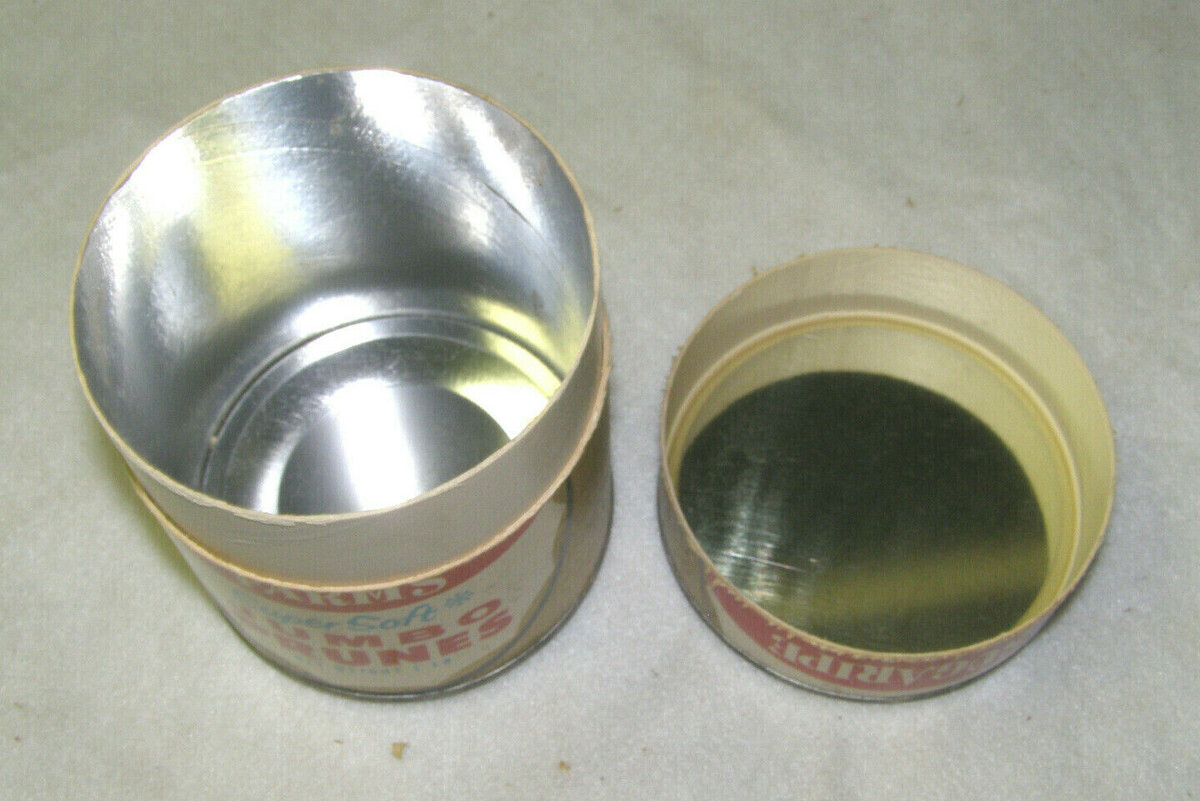 This vintage SUGARIPE FARMS ?JUMBO PRUNES? food canister dates from the 1960?s. The top and bottom are tin, while the sides are of printed cardboard, which are quite sturdy. The split canister has a fitted lift-off lid, revealing the interior, which is foil lined and super clean. SUGARIPE FARMS was from San Jose, California.