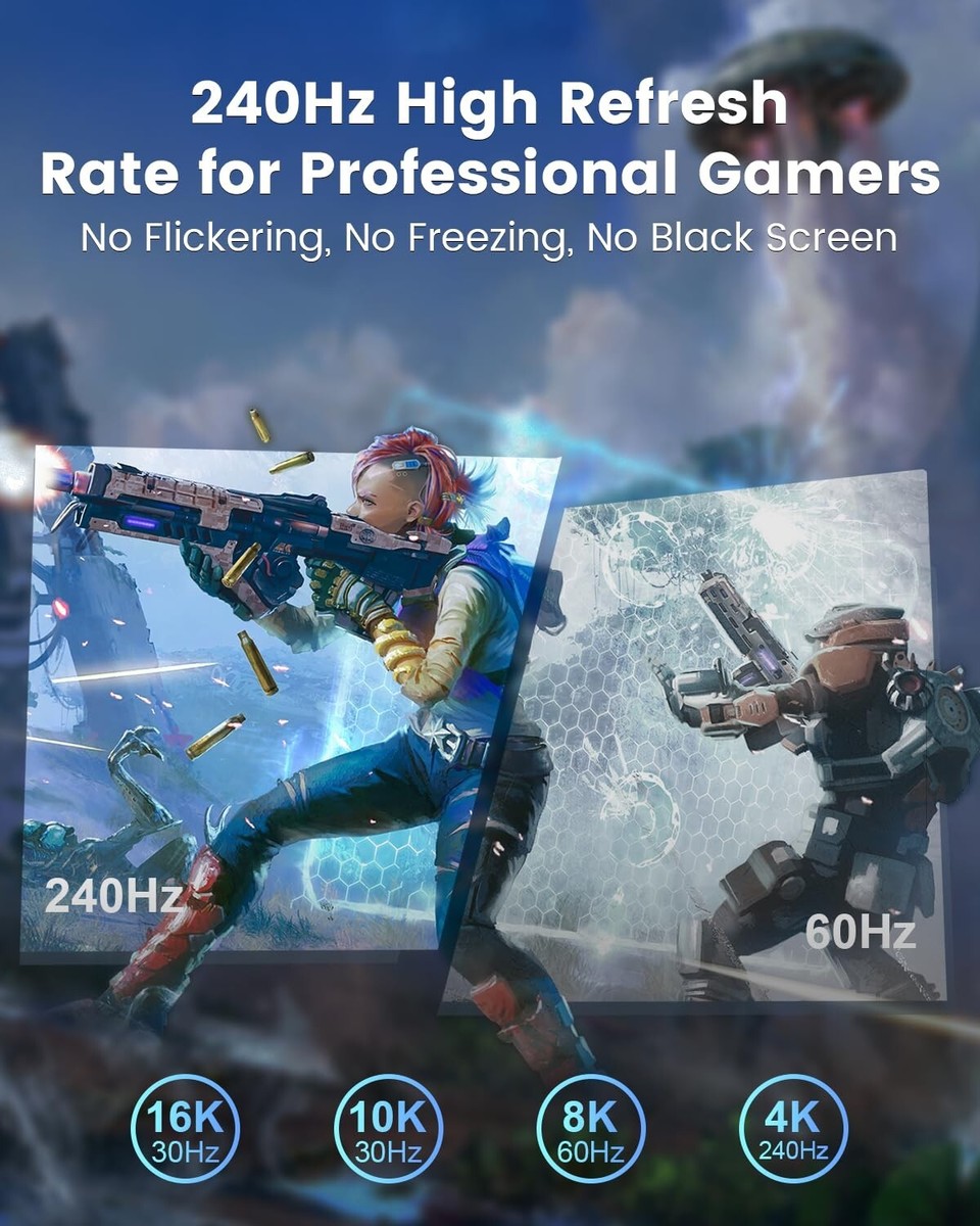 ???Immersive Gaming Experience?Our DisplayPort to DisplayPort cable supports 3D, HDR, HBR20, HDCP , Dynamic HDR, , UHBR10, 3D stereo imaging technology, Auto Low Latency Mode(ALLM) and Variable Refresh Rate(VRR), 32-bit/1536kHz audio channel transmission allows you to finely detect the dynamics of enemies, making it the best choice for enthusiast e-sports players.