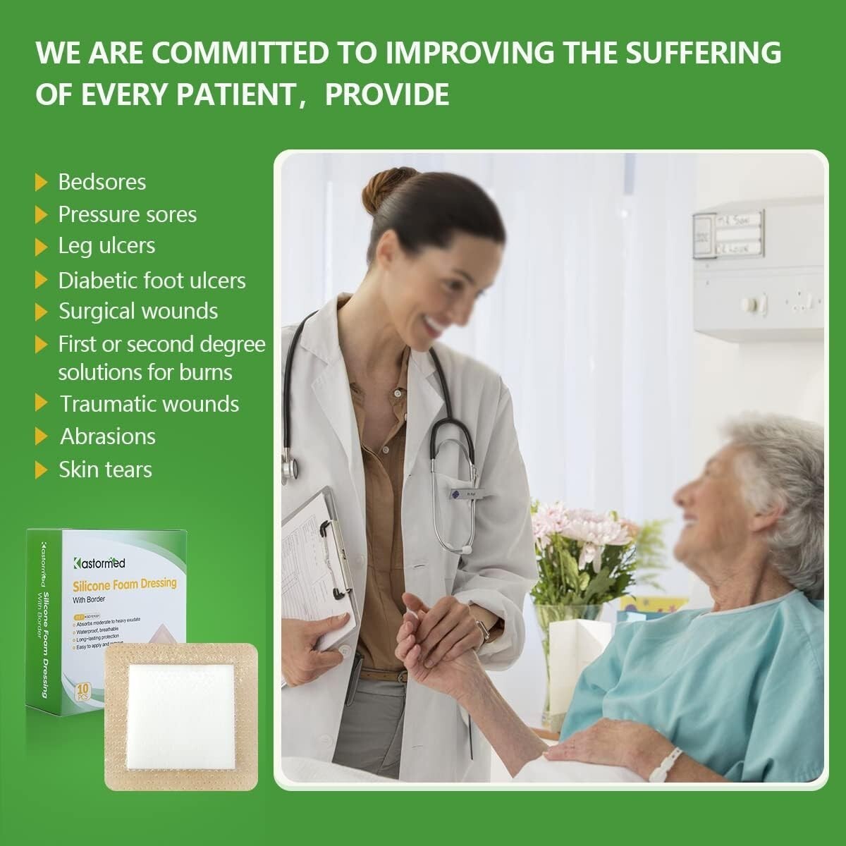 Silicone Adhesive Foam Dressing with Gentle Border 4''x4'' 10 Pack, High Absorbency Foam Wound Bandage for Bed Sore, Leg Ulcer, Diabetic Ulcer