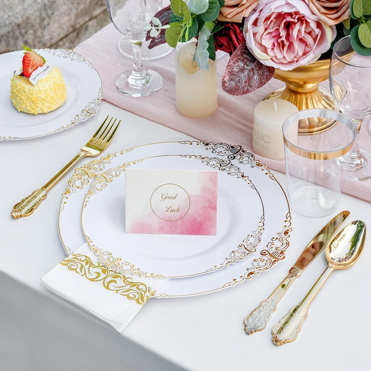 50 Guests Value Pack : Served for 50 white and gold plastic plates include 50 dinner plates, 50 dessert plates, 50 knives, 50 forks, 50 spoons, 50 cups and 50 napkins. Our gold plastic plates are great choice for weddings and parties.