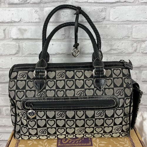 Brighton Gray Black Hearts Satchel Purse Bag Canvas Leather Charm Dustbag & Box