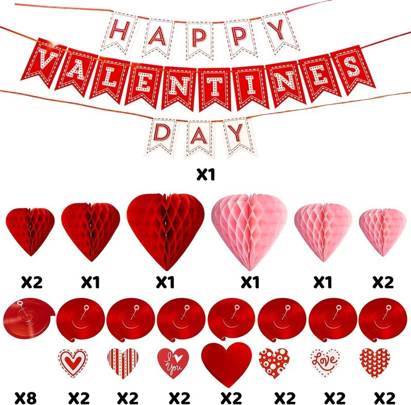 SUPER VALUE PACK. Valentines Day Swirl String Cutout Pack included- Hanging Banner x 1, Red Heart Honeycomb Balls x 4, Pink Heart Honeycomb Balls x 4, Foil Swirls x 8, Foil Swirls with Heart Pendant x 14.