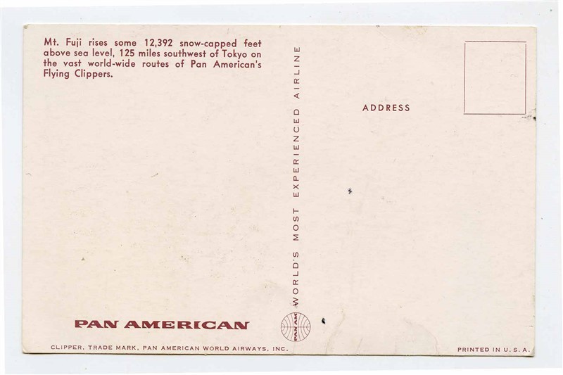 An unused postcard. Pan American World Airways, Mt Fuji Postcard