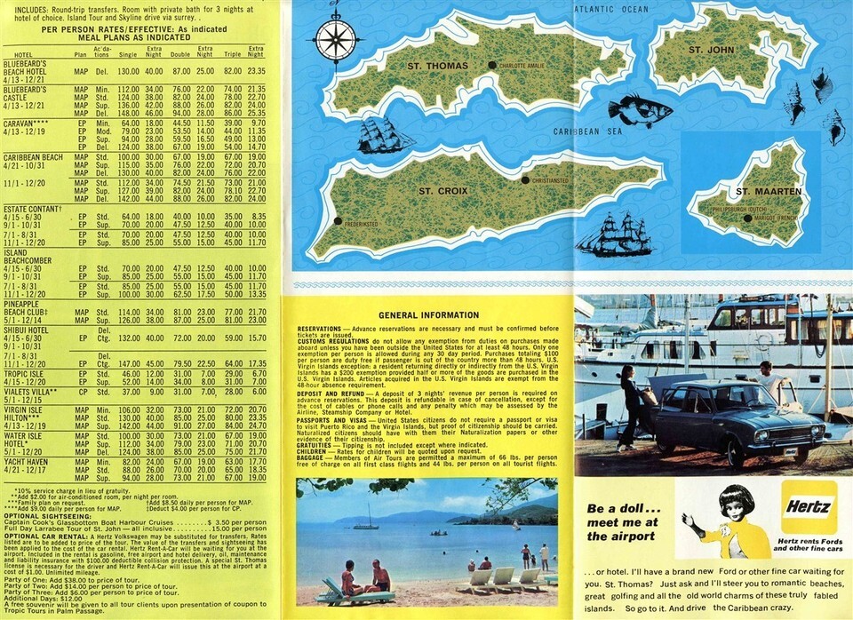 An 8 panel fold out brochure with island maps, detailed hotel rates by island, Includes St Thomas, St John, St Croix and St Maarten. Plus many photos and visitor information. Plus Pan Am sample air fares Pan Am Virgin Islands Holidays Brochure AAA 1969 Summer