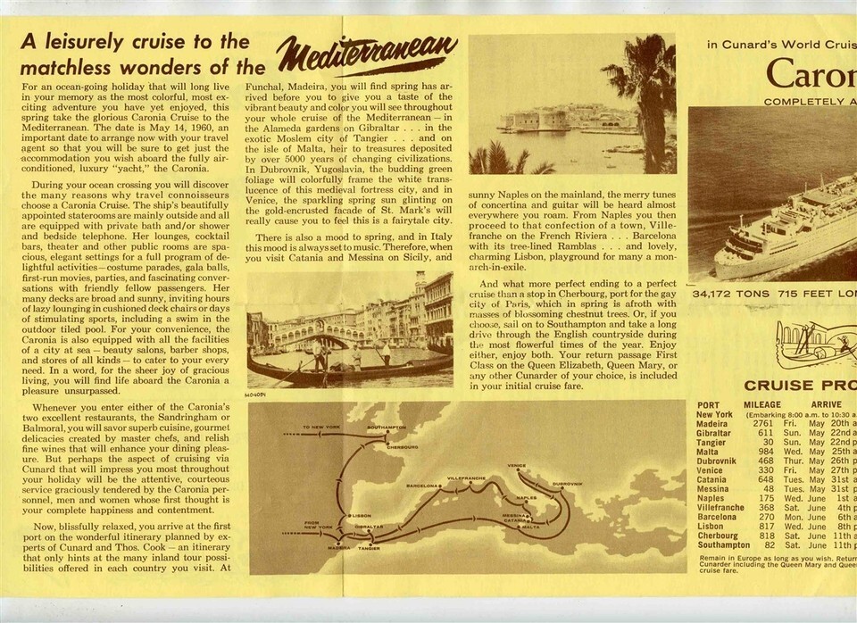 A large 4 panel fold out brochure with Cruise Program, Cruise information, photos, Route Map, Schedule of Fares and more. Cunard Lines CARONIA 1960 Mediterranean Spring Cruise Brochure. Sailing from New York