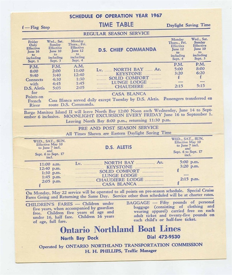 A pocket sized Lake Nipissing the French River Brochure Time Table. With information, time table for the D S Chief Commanda and D S Aletsis, for 1967. Plus fare and photos.