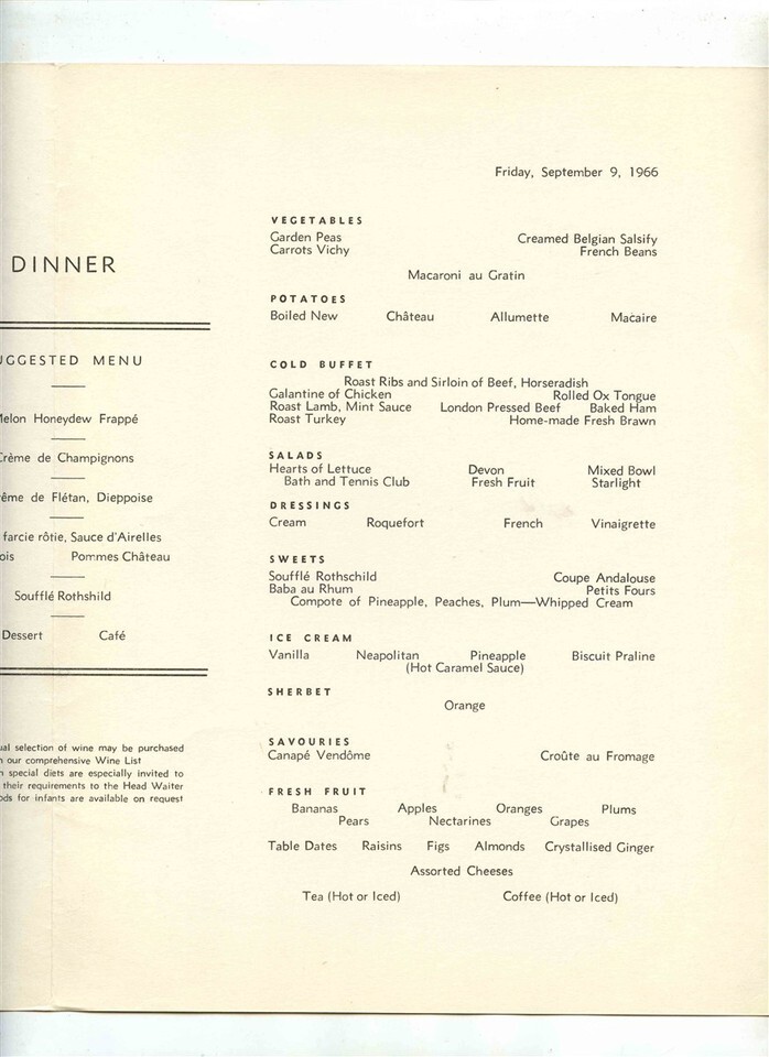A 4 page Cunard Lines RMS Queen Elizabeth Dinner Menu , Dated September 9, 1966 . Has a Gargoyle overlooking the Seine in Paris on the front Cover. Measures about 8" x 10 1/2" when closed.