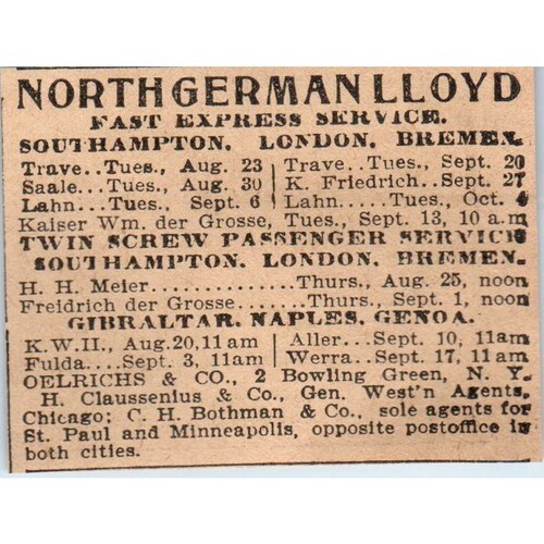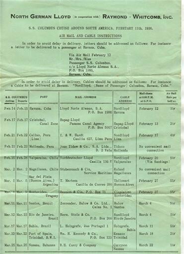 A large single page with blank back. North German Lloyd 1936 Air Mail and Cable Instructions for Passengers. In cooperation with Raymond Whitcomb . How to contract a passenger by Port. and the date on which the air mail or cabloe had to be sent.
