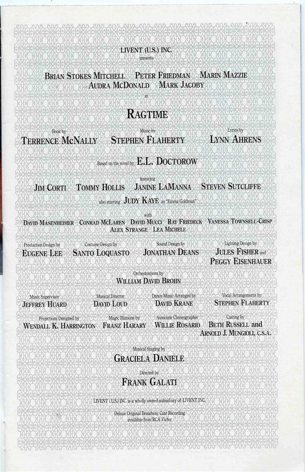 From the Ford Center fo the Performing Arts in New York City during October 1998. Stagebill for Ragtime The Musical With Brian Stokes Mitchell , Audra McDonald , Peter Friedman, Marin Mazzie and Mark Jacoby.