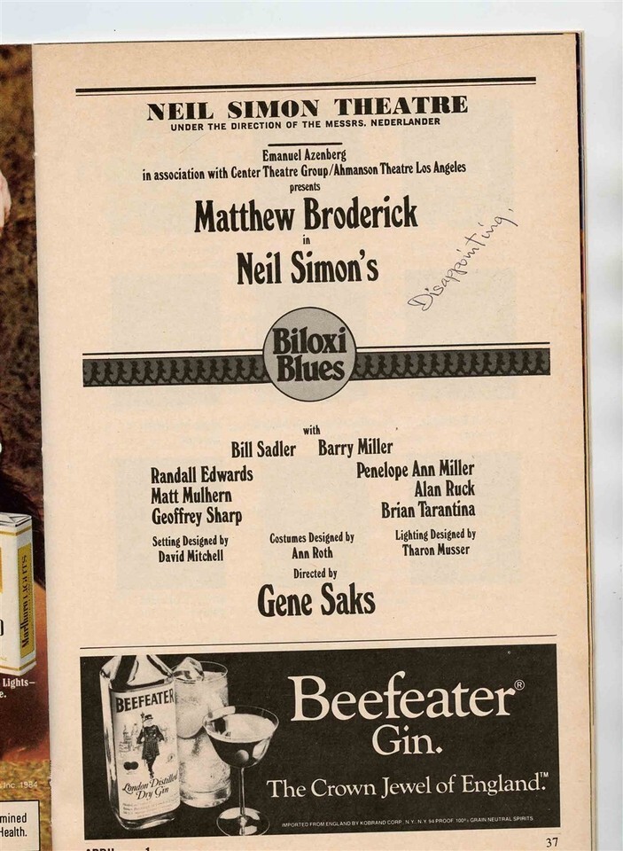 Biloxi Blues Playbill Neil Simon Theatre New York Matthew Broderick 1985