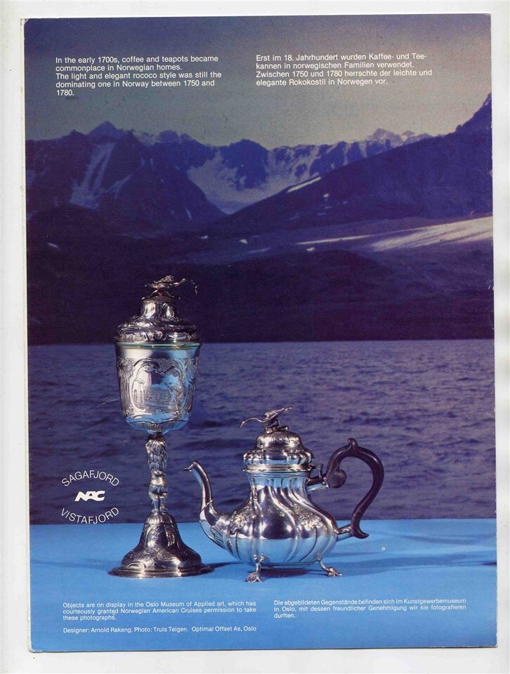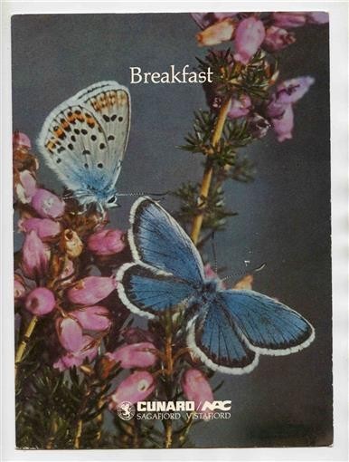 A Set of 3 different M S Sagafjord Menus . One has a cover of items in the Oslo Museum of Applied Art, another has butterflies and flowers and the third an image of the RMS Caronia. From a Cunard NAC Cruise in September 1985. All are in fine condition, but there may be a bumped corner light edge wear or tiny stains. Would look great framed. Bright and vibrant colors. The menus each measure about 7 3/4" x 10 1/2" when closed. The menus are in English.