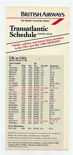 A 2 sided page with USA to UK on one side and UK to USA on the other side. British Airway Transatlantic Schedule Winter 1985-86