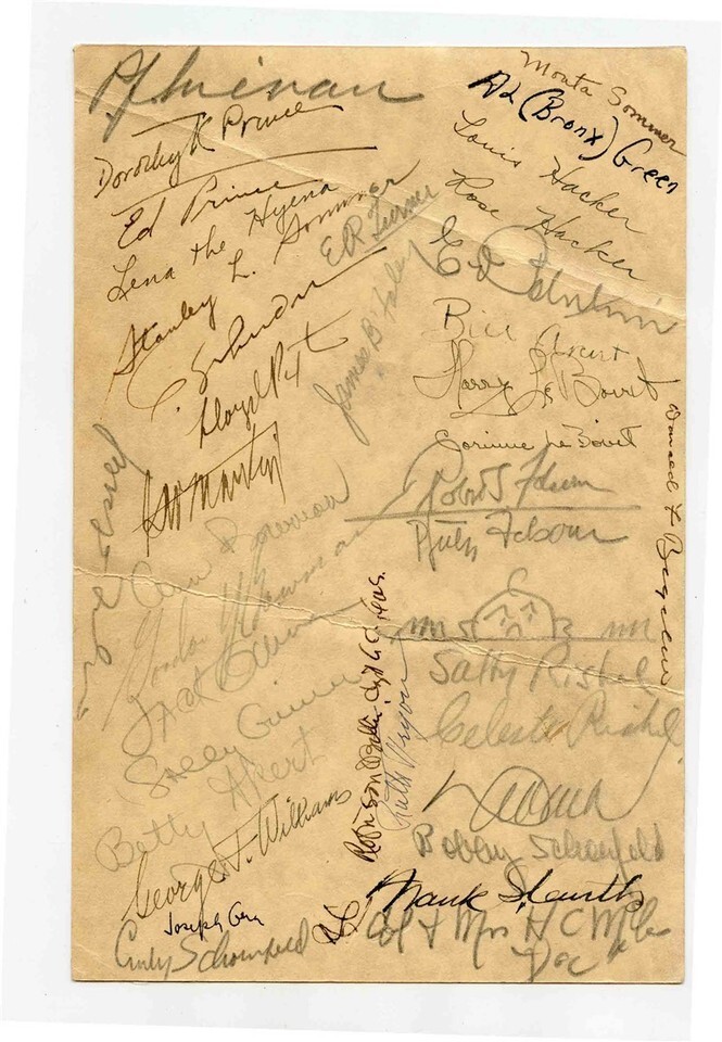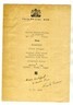 A 2 sided single page Thanksgiving Dinner menu covered with signatures on both sided. One of the signatures is Eleanor Roosevelt. Dated November 28, 1946 . Allied Officers Park Club Thanksgiving Menu 1946, located in Budapest Hungary . Measures about 5 1/4"x 8". Lots of signatures