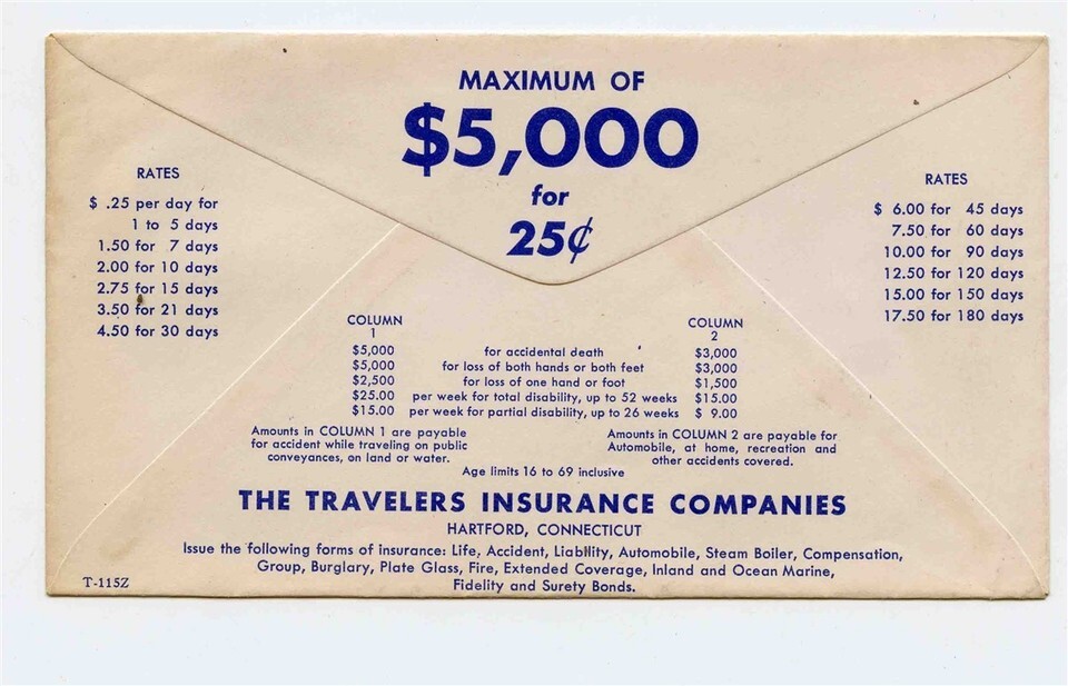 A used and empty envelope. The Pioneer The Travelers Insurance Company Railroad Ticket Jacket HAs Travelers Insurance advertising and rates on the back.