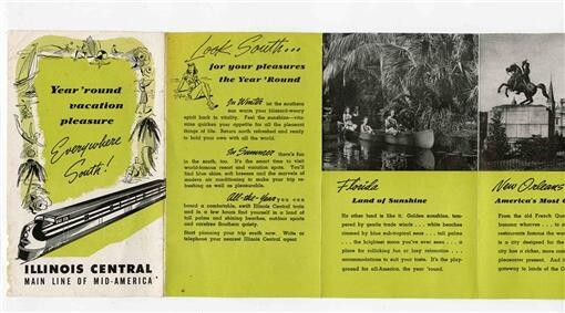 A 12 panel fold out brochure with route map, destination photos and information, name train information and more. Illinois Central Railroad Main Line of Mid America Brochure Everywhere South