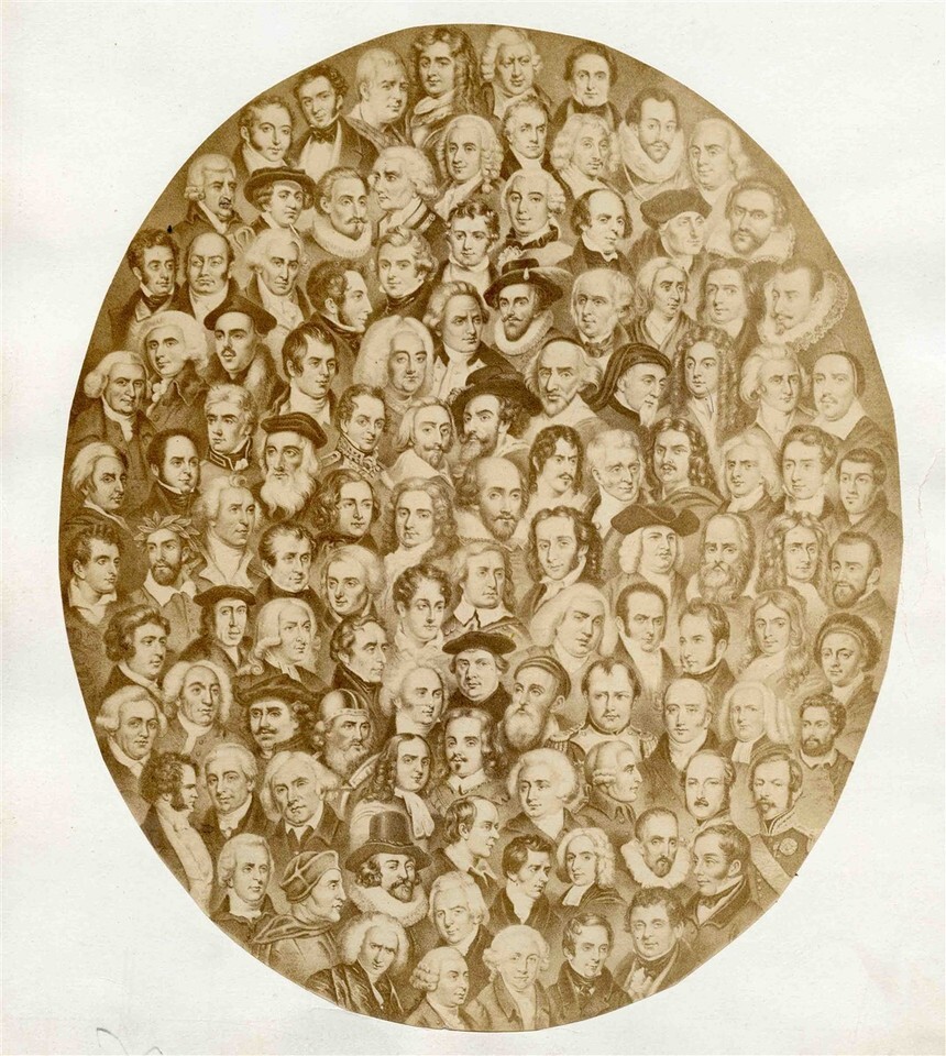 A 8 1/2" x 10 1/2" oval of 112 Portraits of Eminent Men of All Ages and Countries. Has an overlay with names of each of the 112 Eminent Men.