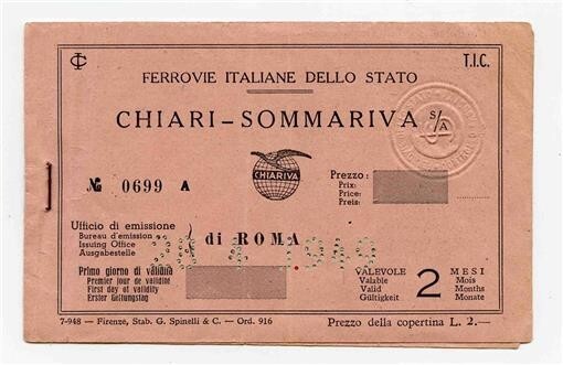 Chiari Sommariva Italian State Railways . A 1949 Used Ticket Booklet with one interior pages in a stapled cover. Has been punched and embossed