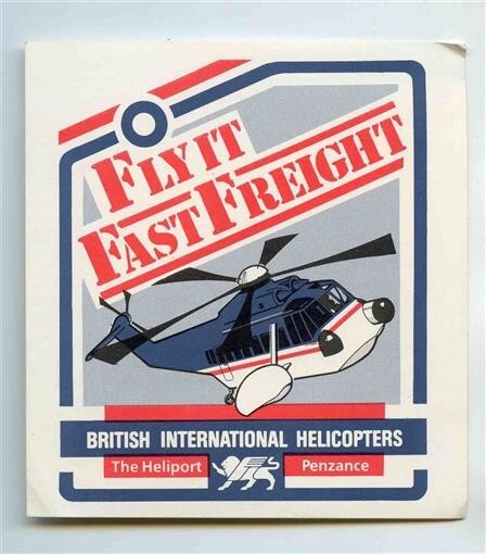 A 4" x 4" unused British International Helicopters Peel Off Sticker, Fly It Fast Freight