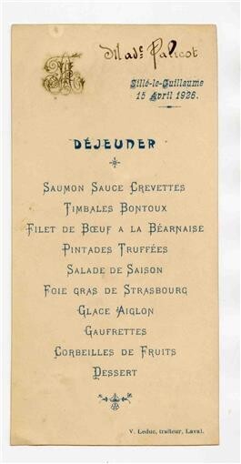 Measures about 3" x 6". An embossed menu with guest name hand written. Sillie le Guillaume French Commune Embossed Restaurant Menu Card, dated April 15, 1926. By V Leduc, Traiteur of Laval