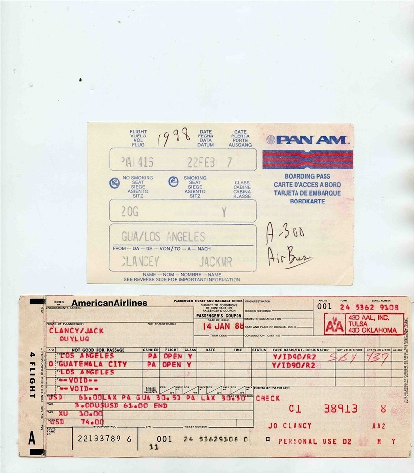 Pan American World Airways Economy Class Ticket Jacket , Ticket on American Airlines Stock Boarding Pass From a 1988 Flight from Guatemala City to Los Angeles