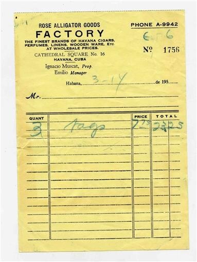 Rose Alligator Goods Factory Receipt Havana Habana Cuba 1955
