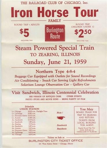Iron Horse Tour Brochure by The Railroad Club of Chicago for June 21, 1959 . Measures about 8 1/2" x 12 1/4" with blank back. For a ride of the Steam Powered Special Train to Zearing Illinois, A Northern Type 4-8-4. With schedule and other information.