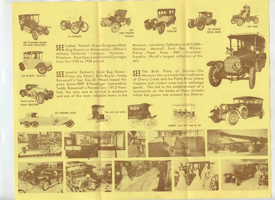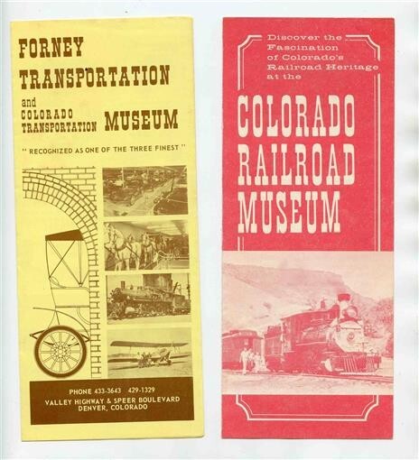 There are 2 different brochures in this lot. A 4 panel illustrated Colorado Railroad Museum brochure . With information, area map and more on this Golden Colorado Museum. And a nicely illustrated 6 panel fold out brochure on the Forney Transportation and Colorado Transportation Museum in Denver. Brochures