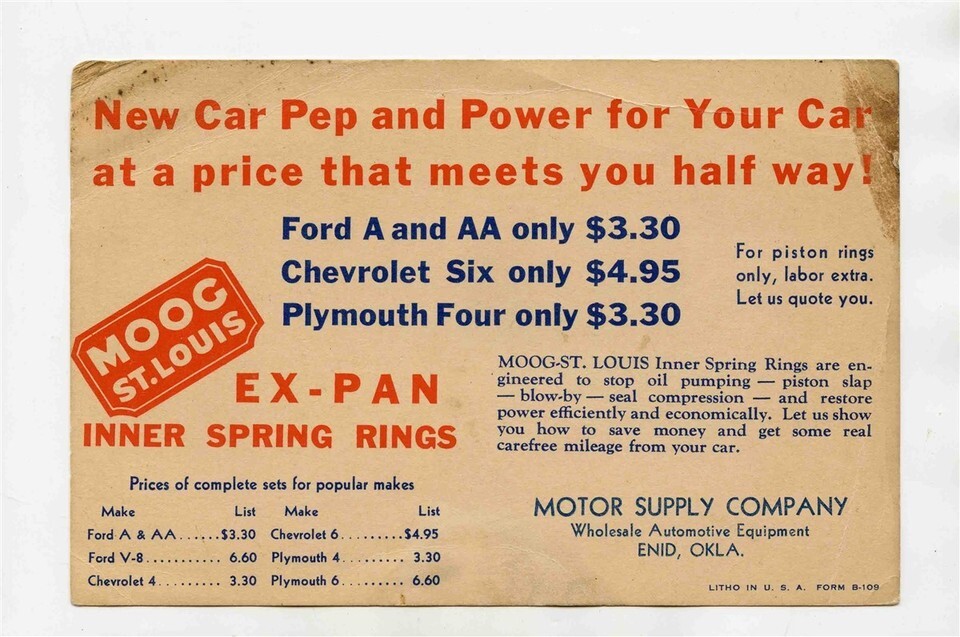 MOOG St Louis Inner Spring Rings Ad Card 1930's New Car Pep