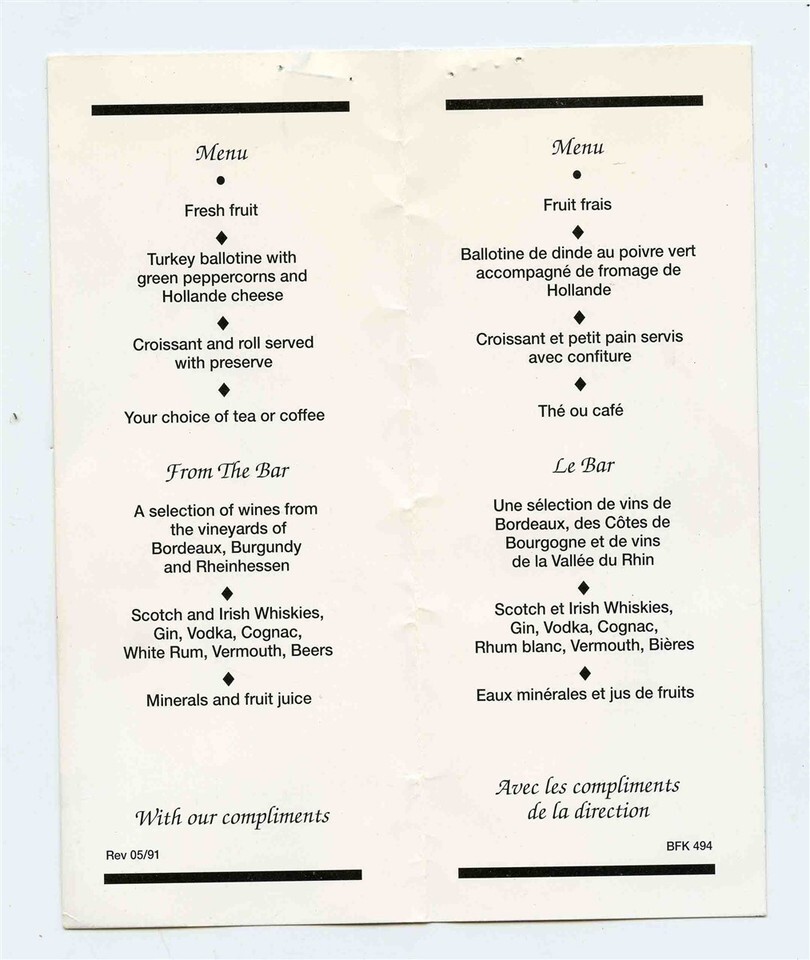 A pocket sized 4 page British Midland Airways Ltd Diamond Service Menu Dated 1991.