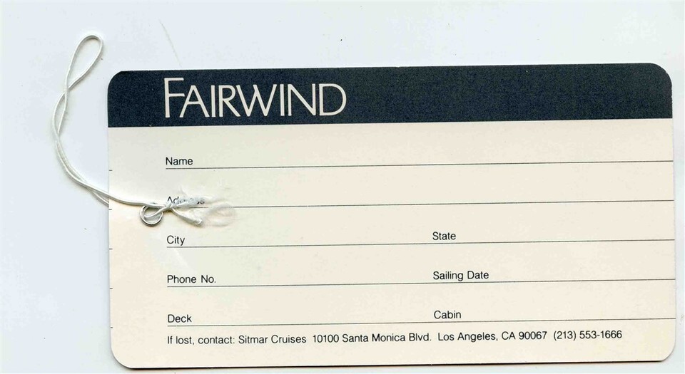 Sitmar Cruises Fairwind Unused Luggage Tag with String