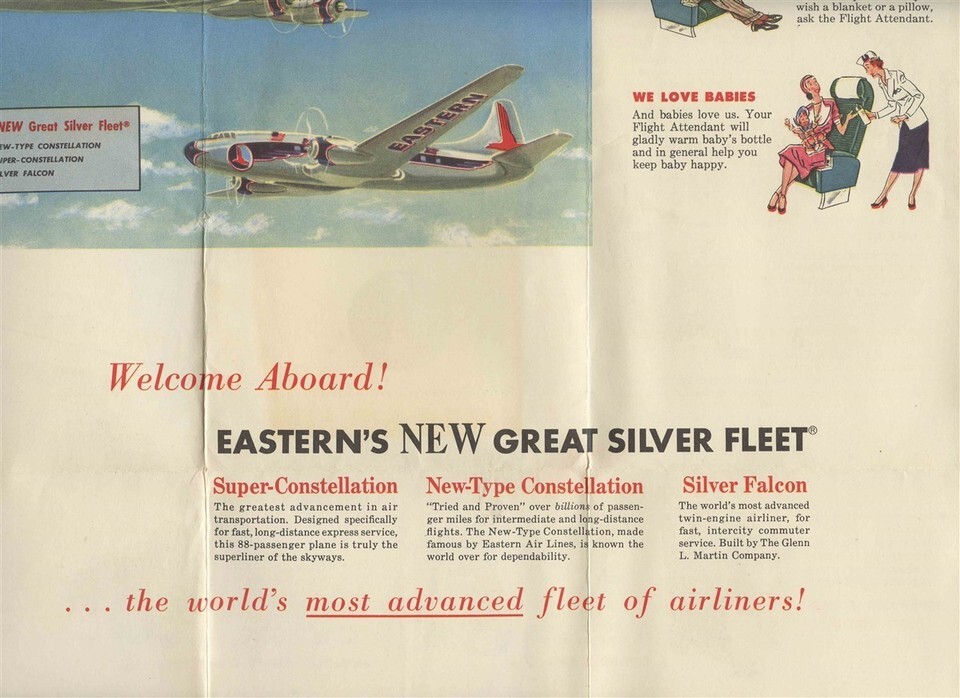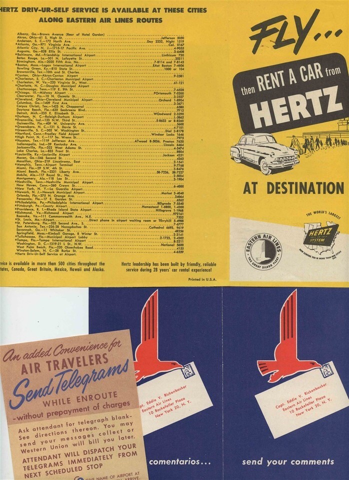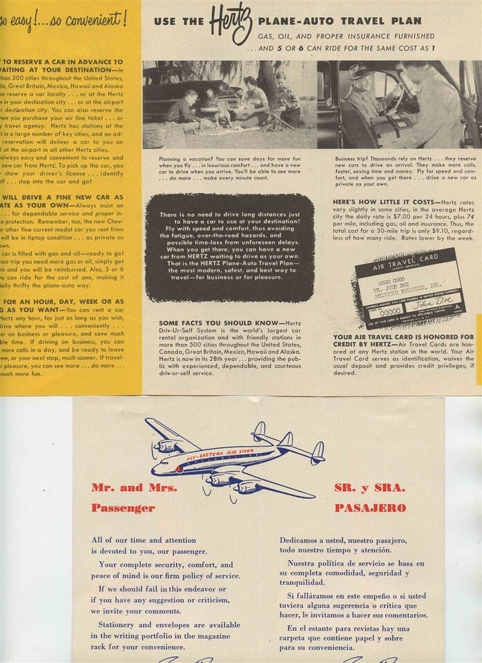 A very colorful 6 panel fold out folder with color images of Super Constellation, New Type Constellation and Silver Falcon . Plus pockets with If You Wish Comment Card, Fly , then rent a car with Hertz brochure, and a Send Telegrams flyer.