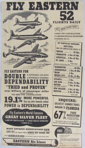 A 14 page Eastern Airlines Complete System Time Table , effective January 1952/ Route Map, schedules and more.