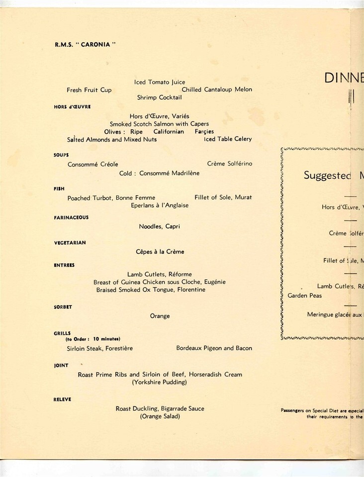 Cunard Lines Dinner Menu R M S Caronia 1954 Cunard Logo Cover