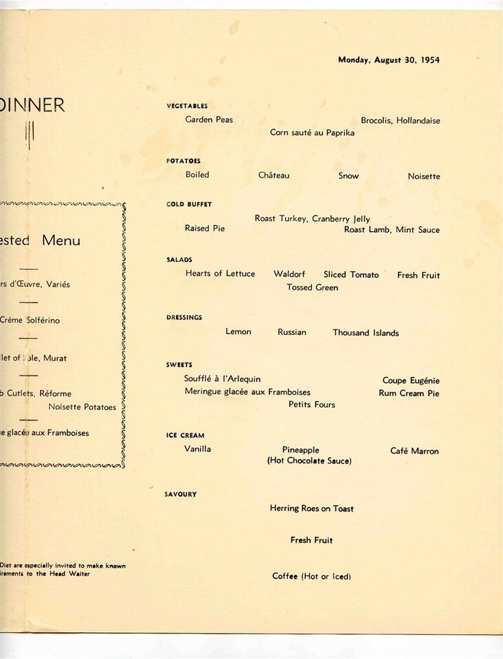 A Cunard Lines Dinner Menu from a R M S Caronia Cruise on August 30, 1954. With Cunard Logo Cover. Measures about 8 1/4" x 10 1/2" when closed.