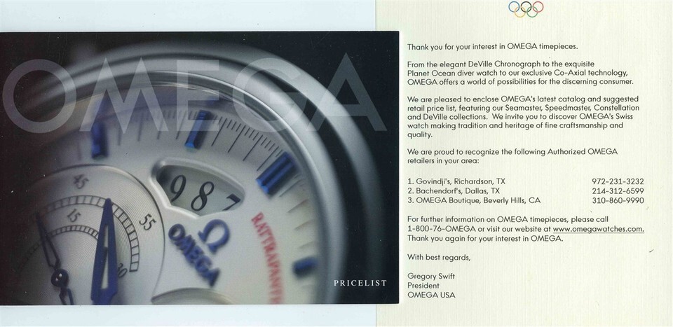 A beautiful Omega Watch Catalog Book Pricelist in the Original Box. From 2005. Plus a inserted sheet of local authorized dealers.