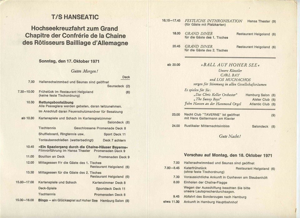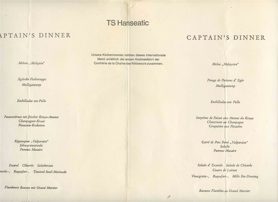 A 4 page Deutsche Atlantik Linie TS Hanseatic Captains Dinner Menu, October 16, 1971. In German and English. Plus 2 Daily Programs for October 16 and 17 , 1971 in German. Menu measures about 8 1/4" x 11 3/4" when closed.