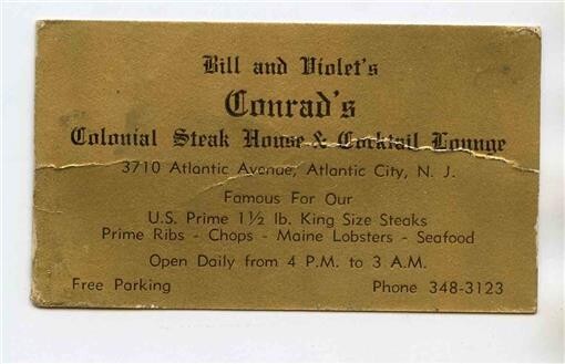 A Conrad's Colonial Steak House Cocktail Lounge Business Card. Was located on Atlantic Avenue in Atlantic City New Jersey
