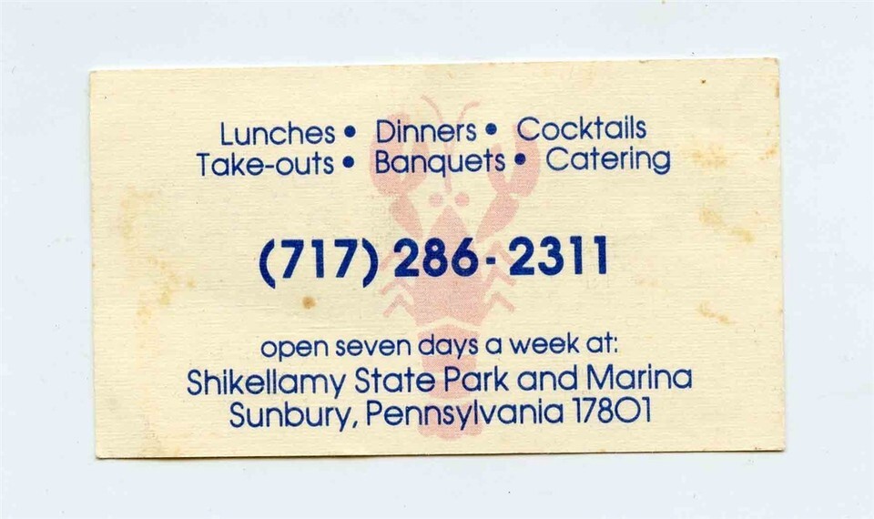 The Marina Restaurant Business Card Shikellamy State Park Sunbury Pennsylvania