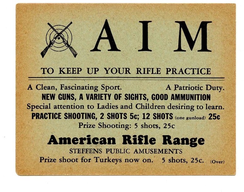 A 2 sided 4 1/2" x 3 3/4" card. Grand Turkey Shoot Now On with Mutt and Jeff Cartoon. Five Shots for 25 Cents at the American Rifle Range in Klamath Falls Oregon, Circa 1950's. AIM to keep up your rifle practice
