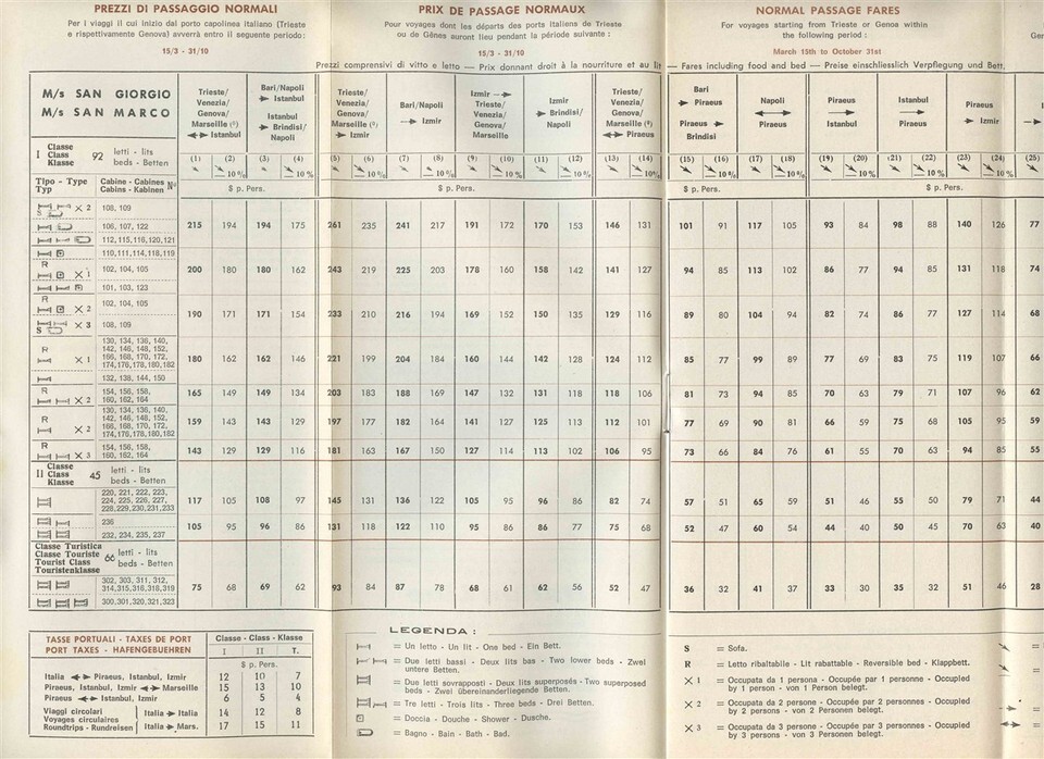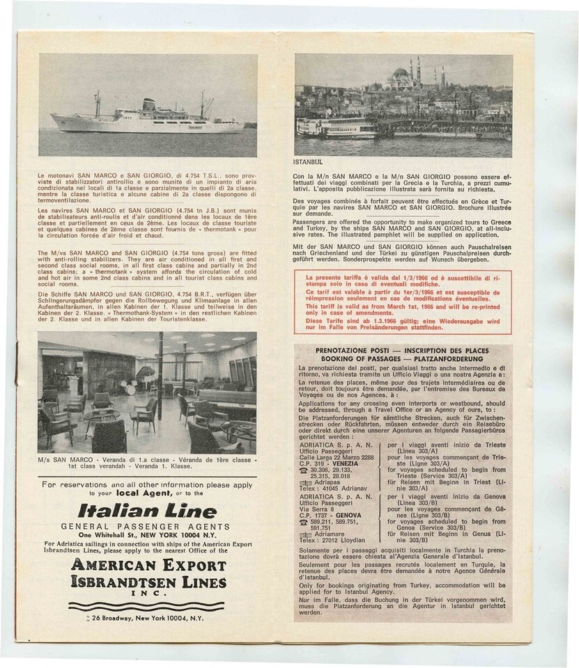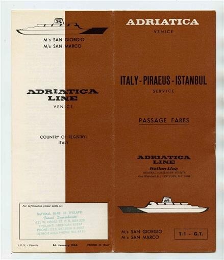 A large illustrated 12 page brochure of Passenger fares, photos, passenger information and more . In multiple Languages. For Italy to Piraeus to Istanbul Service. Adriatica Line Venice Brochure . For the M/S San Giorgio M/S San Marco in 1966. An Italian Line . Includes ships interior and exterior photos,