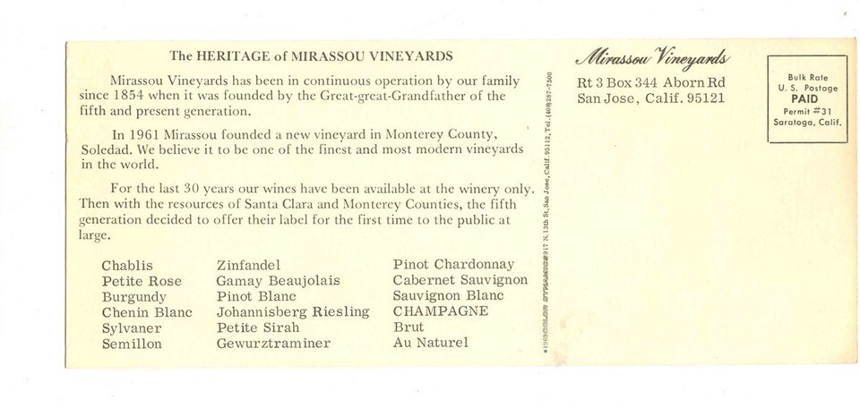 A large unused advertising postcard. The Heritage of Mirassou Vineyards Advertising Postcard. Measures about 3 1/2" x 9 1/2".