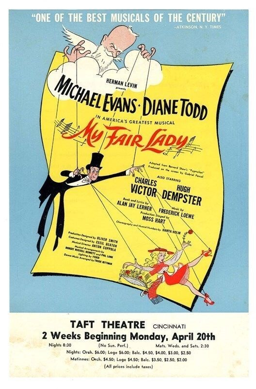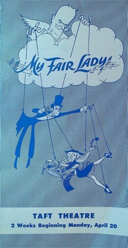 A souvenir program and a performance program from road company production of The Music Man. Starring Forrest Tucker, Joan Weldon , Cliff Hall and Benny Baker. In very fine condition. Great photos of the production cast and crew with detailed biographies of the cast and crew. Dated 1959. Plus a colorful single page flyer advertising My Fair Lady at the Taft Theatre in Cincinnati