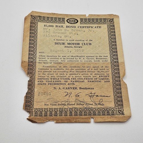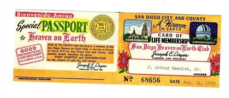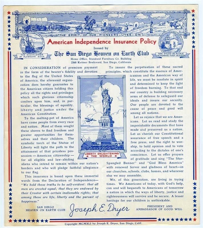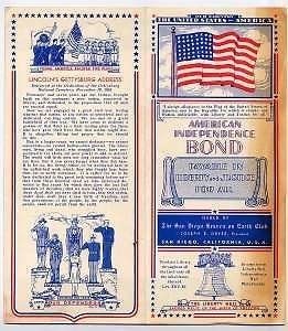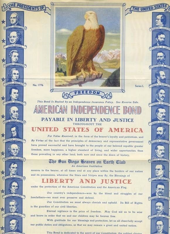 An American Independence Bond, payable in Liberty and Justice For All. Issued by The San Diego Heaven and Earth Club. Copyright 1916, but this is from the late 1930's. In fine condition with age fading on the cover. On the inside are pictures on the Presidents from Washington to FDR. A wonderful patriotic item. Plus a 4 panel Card of Life Membership of the San Diego Heaven on Earth Club in very fine condition.