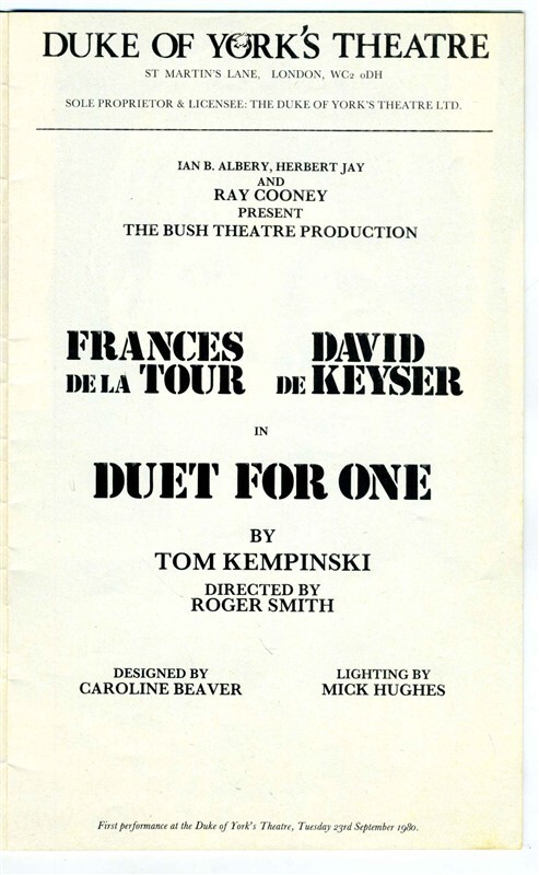 A program for a program from a performance of Duet For One at the Duke of York Theatre in London, Dated 1980, starring Frances De La Tour and David De Keyser.