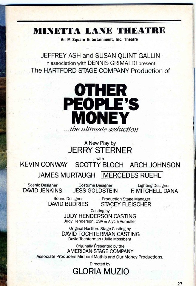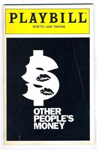 A Playbill for Other People's Money from a performance in 1989 at the Minetta Lane Theatre in New York City. In fine condition. Starring Kevin Conway Scotty Bloch and Mercedes Ruehl