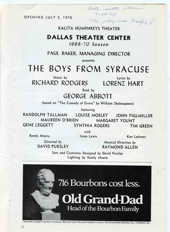 From the Dallas Theatre Center in 1970. The Boys From Syracuse Playbill , Starring Randolph Tallman, previously a star of the New Christy Minstrels