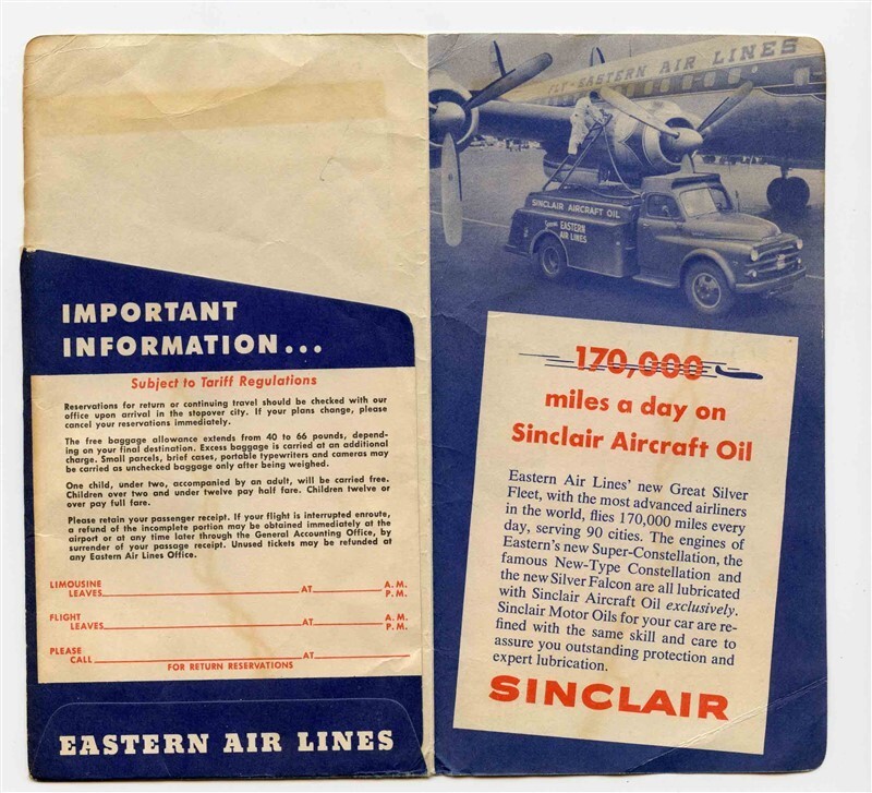 An Eastern Airlines Ticket Jacket with 3 Different airplanes and a Route map on the covers. Inside is an Eastern Airlines Passenger Ticket and Baggage Check from a 1952 flight from Albany Georgia to Atlanta to New York Idlewild . All in very good condition. Plus a Eastern Airlines Reboarding Pass, a Notice to Re-Confirm your Reservation and a Flight Insurance Policy