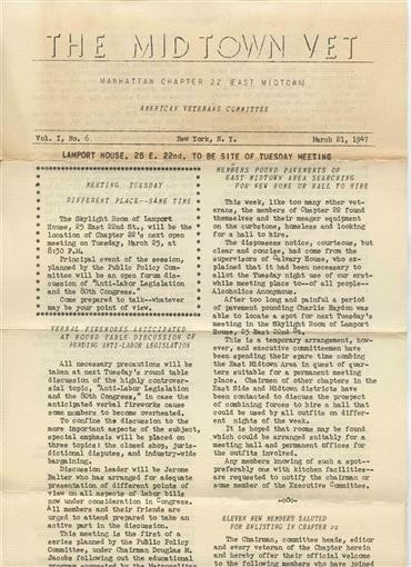 A large 2 sided single page issue. The Midtown Vet for March 21 1947 , Published by the American Veterans Committee, Manhattan Chapter 22. Deals with Veterans Issues
