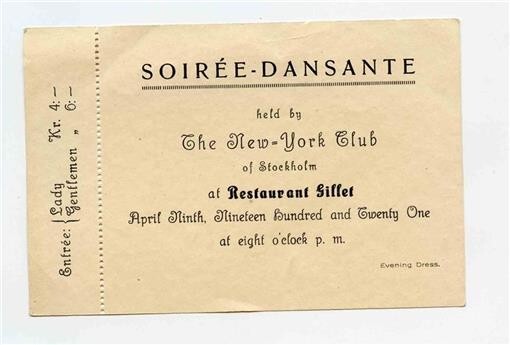 Soiree Dansante Ticket by The New York Club of Stockholm 1921 Restaurant Siffet