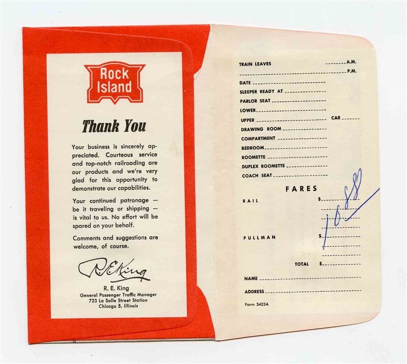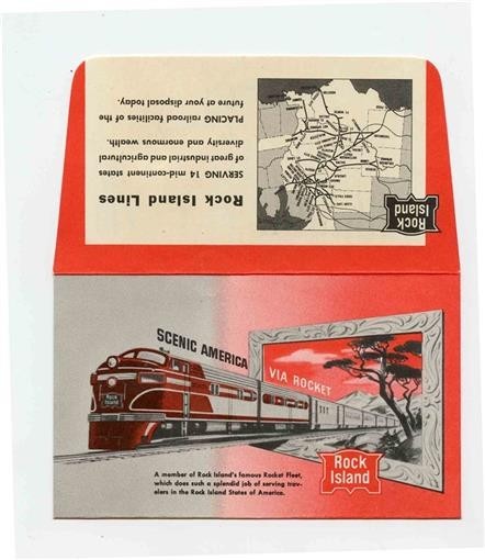 A used pocket sized Rock Island Lines Railroad Ticket Jacket . The Ticket Jacket has fare written in. Has Route Map. Measures about 2 3/4" x 4 5/8" when closed.
